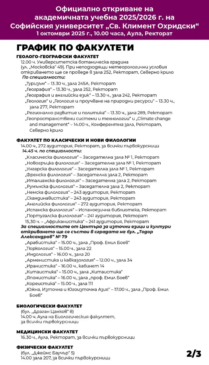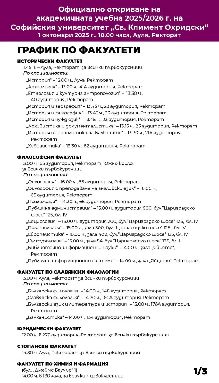 Вижте кога всеки от факултетите в Софийския университет "Св. Климент Охридски" ще отвори врати, за да сложи начало на новата учебна година.
