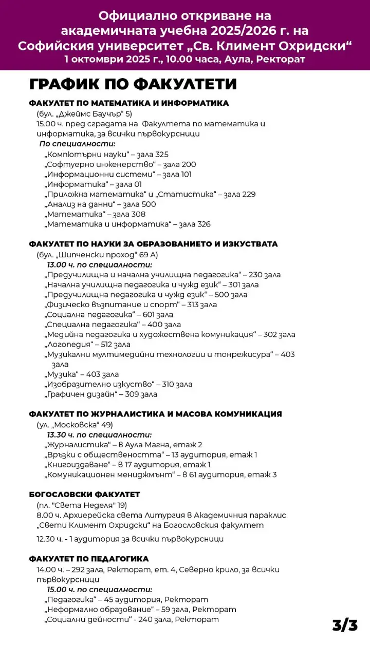 Официалното откриване на академичната 2025/2026 г. за студентите на ФЖМК ще бъде от 13:30 ч. на ул. „Московска“ 49.